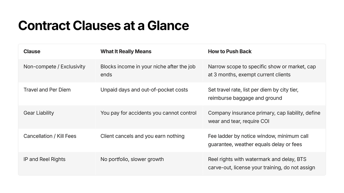 Contracts in broadcasting look harmless until a schedule shifts, a flight is canceled, or your side project takes off. Here is a plain-English field guide to five clauses that quietly drain time, money, and momentum, plus simple ways to push back without blowing a deal.